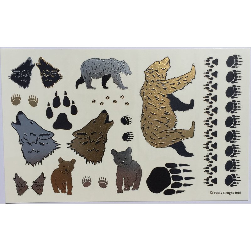 Bear and Wolves Temporary Tattoos for Kids | 32 Tattoos on 2 Sheets | Fake Tattoos for Boys and Girls | Fun Metallic Shiny Animal Tattoos for Kids | By Twink Designs