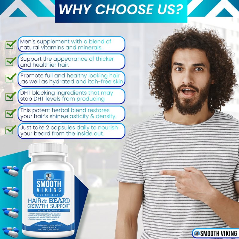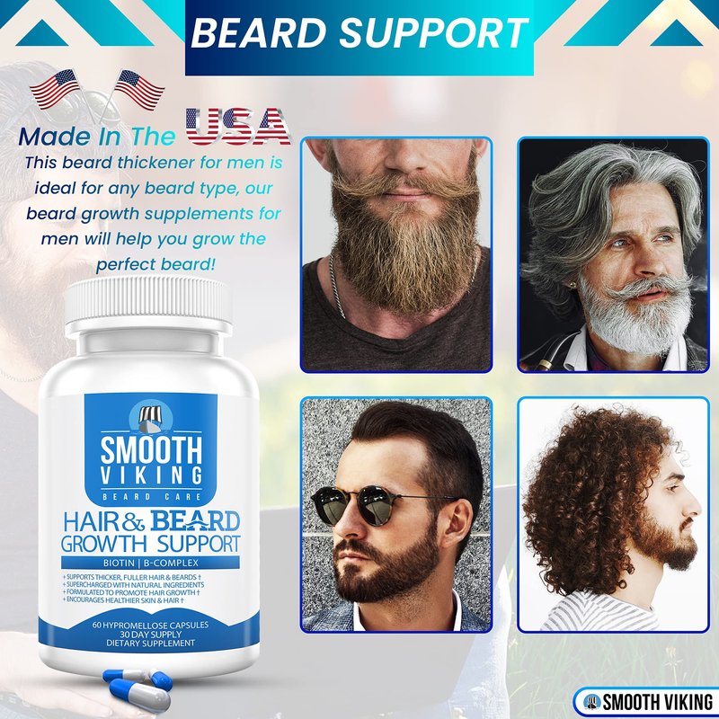 - HAIR & BEARD GROWTH SUPPORT: Smooth Viking ultimate hair growth support is a specially formulated men’s supplement with a blend of natural vitamins and minerals that support the appearance of thicker and healthier hair for the scalp and facial hair area. Whether its for a dapper hairdo or an awesome beard, our beard growth pills will help promote full and healthy looking hair, as well as hydrated and itch-free skin. Our beard pills will help stimulate your beard growth speed.