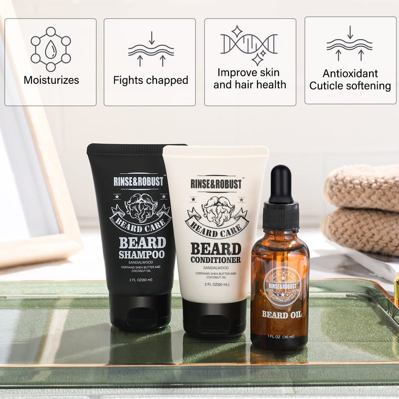 - 【🧔Beard Grooming Set】Rinse&Robust 8pcs beard care set with travelling bag includes everything which could help you keep beard clean and tidy. Our well-made Beard Brush,Beard Comb,Beard Scissors make trimming,shaping your beard easier than ever.Of course also beard shampoo and conditioner, beard balm and beard oil are all in this travelling bag.Rinse&Robust are professional in men’s facial care and everything is designed for you.