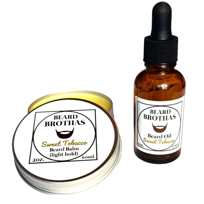 Beard Brothas Sweet Tobacco beard oil and beard balm combo set! Crafted with care and expertise, this unique combo set is specially designed to condition and style your beard to perfection. Our signature Sweet Tobacco fragrance will envelop you in a warm and inviting aroma that's sure to turn heads. The beard oil is made with a special blend of natural oils that penetrate deep into your beard, leaving it feeling soft, shiny, and manageable. The beard balm provides a light hold that keeps your beard in place all day long. It's perfect for taming stray hairs and shaping your beard into the perfect style. Try Beard Brothas Sweet Tobacco beard oil and beard balm combo set today and experience the difference for yourself. It also makes the perfect gift for the bearded man in your life!