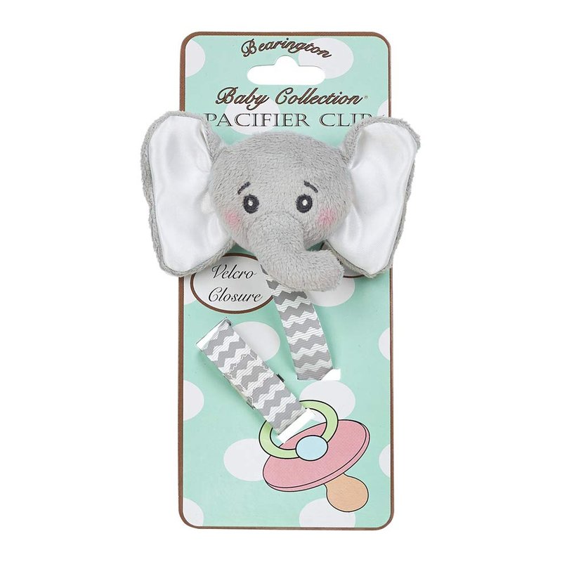 Bearington Collection Baby Pacifier Holder Clip for Baby Girls & Boys | Lil’ Spout Plush Gray Elephant Binkie & Paci Clip | Non Silicone | Satin Leash, Strap, & Binky Clip