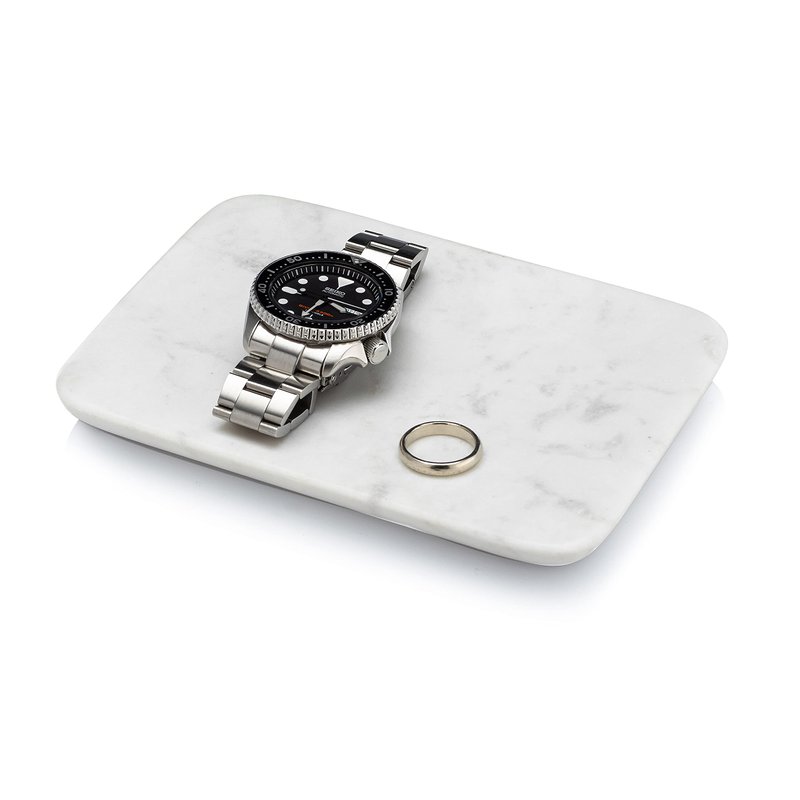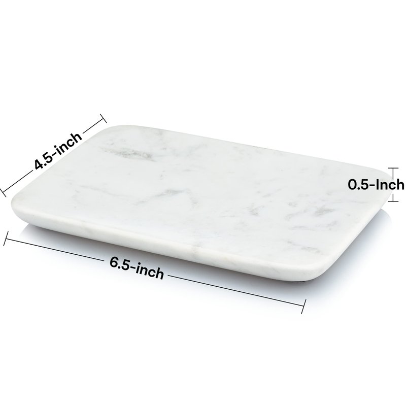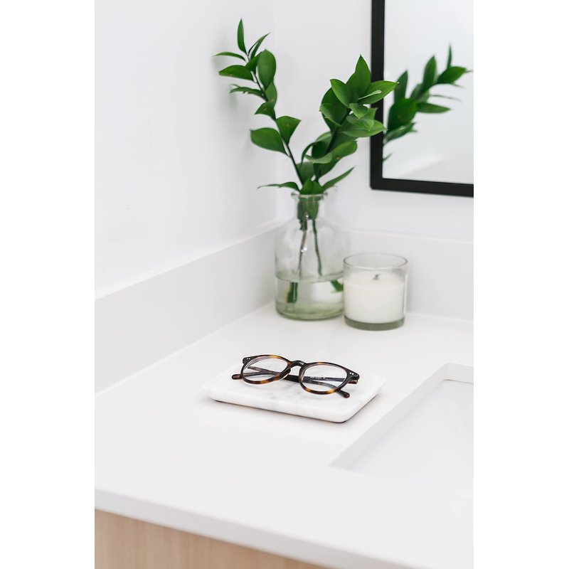 - SOLID WHITE MARBLE: Handcrafted from a solid block of natural white marble, our tray features a slight concave, or curve, to keep your possessions in place. 4 soft black felt pads on the bottom protect the tray and your countertops from scratches or scuffs.