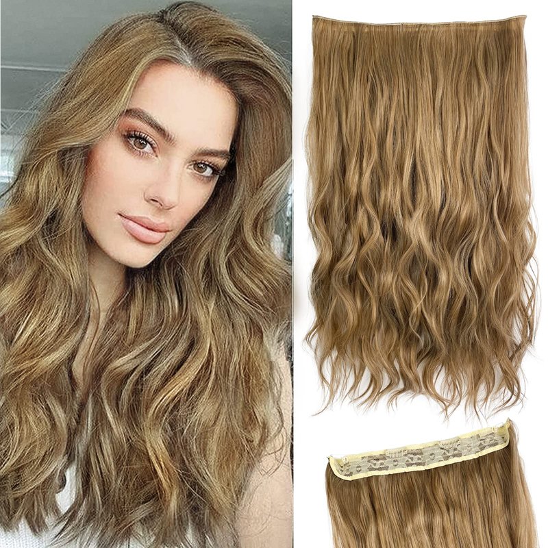 BEAUEXE Invisible Wire Halo Hair Extensions for Women Long Wavy Adjustable Synthetic Hair Pieces Removable Secure Clips Hairpieces Secret Extensions 20'' Golden Brown, 1.0 Count
