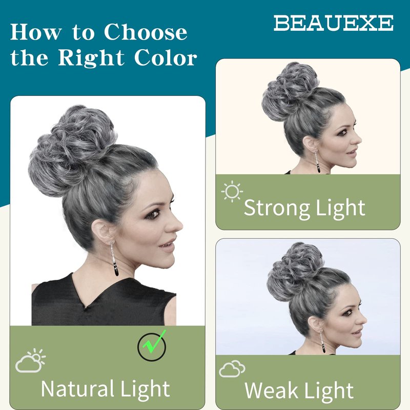 BEAUEXE-Professional beauty manufacturing experts. Each of our products like process to more beautiful you.Specification:Brand:BEAUEXEProduct Name: BEAUEXE messy hair bunProduct Size: Width:7",Height:3.5" After fully extendedProduct Weight: Approx 1.94 OZ(55 Gr)Product Color: Silver Gray Black MixedProduct Style: Curly bun maker for hairProduct Material: Premium synthetic heat-resistant fiber/ Elastic bandPackage included: 1PCS Messy hair bun hair scrunchies for women's hair+resealable bagHow to use: Open it then shake it after receiving. If needed, secure with bobby pins.(Due to transportation and storage, the product may not look good in shape. )How to care: 1 Wash with warm or cold water, No hot water,it'll damage the curly bun for hair2 Add a little shampoo, conditioner wash gently3 Let it air dry.Do not dye, twist, wring, squeeze your short hair extensions.Tips: Color may vary due to the difference between the display or lighting , Please in kind prevail.