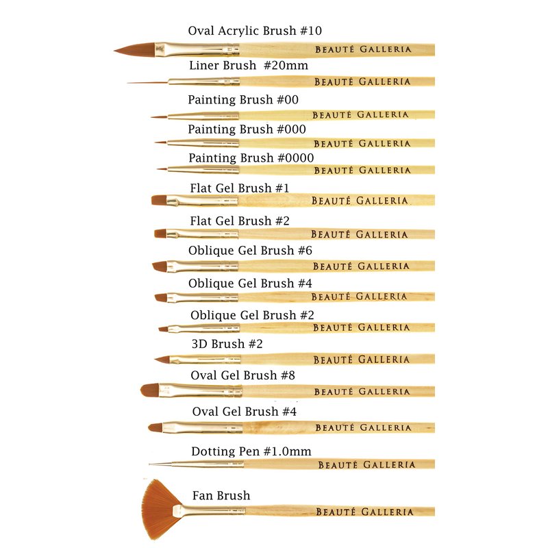 BEAUTÉ GALLERIA 15pcs Nail Art Brush Set is ideal for fine work to draw lines, detailing flowers or creating special patterns. This nail art brush set will help you create hundreds of different designs including dots, swirls, lines, flowers and anything you like. Perfect for professional nail salons and DIY high-quality nail art at home. Great for all kinds of acrylic nails and French nails.Beaute Galleria 15pcs Nail Art Brushes With Wooden Handles - 5x Gel Brushes ( 3x Oblique Gel Brushes, 2x Flat Gel Brushes ) - 3x Oval Gel Brushes- 3x Painting Brushes - 1x 3D Brush - 1x Dotting Tool - 1x Fan Brush - 1x Liner Brush.