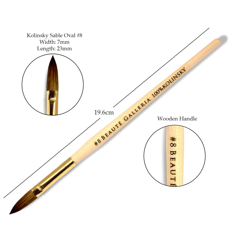 The BEAUTÉ GALLERIA Oval Shaped Kolinsky Sable Nail Art Brushes Set is your ultimate choice for achieving smooth acrylic overlays, expert acrylic nail sculpting, precise nail shaping, intricate 3D nail carving, and seamless nail extensions. Whether you're a professional in a nail salon or a DIY enthusiast creating nail art at home, these brushes are the perfect companions for precision and creativity. Cleaning Your Brush: 1. Always clean your brush immediately after use. 2. Pour nailbrush cleaner solution into a glass container. The cleaning solution is usually available at beauty supply stores. Swish the brush in the cleaner solution until visibly clean. 3. Remove liquid from the brush by dabbing the bristles on a paper towel. Try not to press the brush too hard on the paper towel as the bristles are delicate and can come off if too much force is used. 4. With your fingers, gently reshape the brush and allow to dry. 5. (Optional) Apply a little cuticle oil or olive oil on the tip of the brush after you have finished cleaning it. This will keep the bristles soft. To clean the oil off, run the brush through warm, soapy water. Note: Wash the brushes in warm water before using them, and properly clean after use; this will keep them in good condition and can extend the life of the nail brush.
