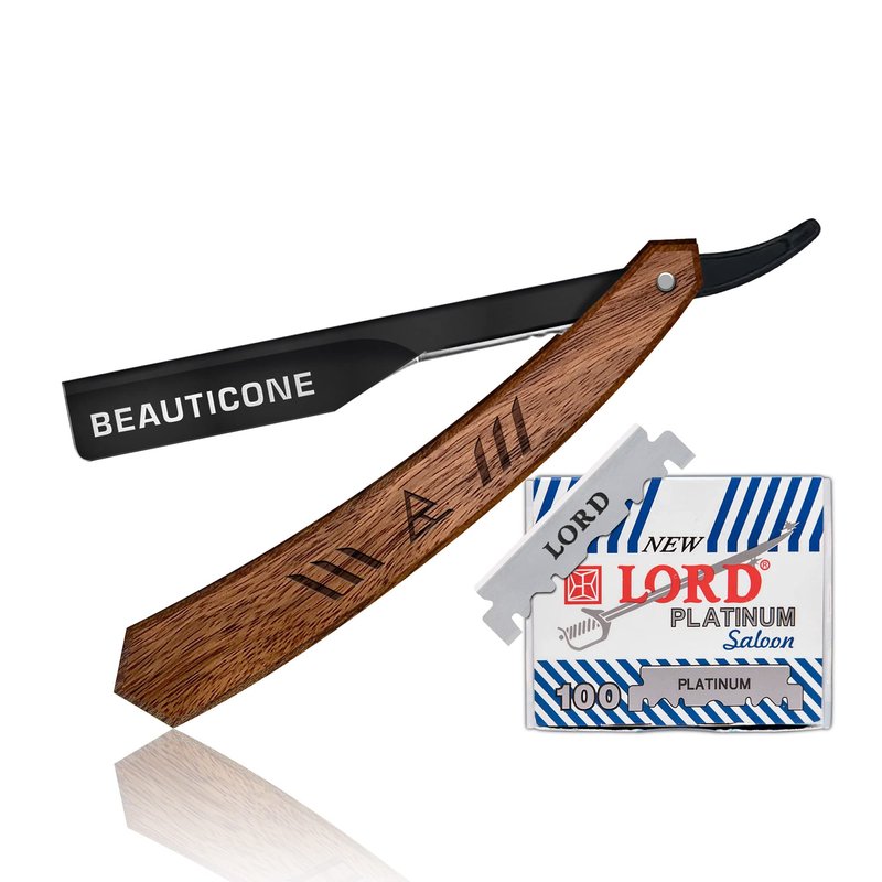 BEAUTICONE Straight Razor | Professional Barber Rose Wooden Razor with Black blade holder for men with 100 Single Edge Blades │slide-out design