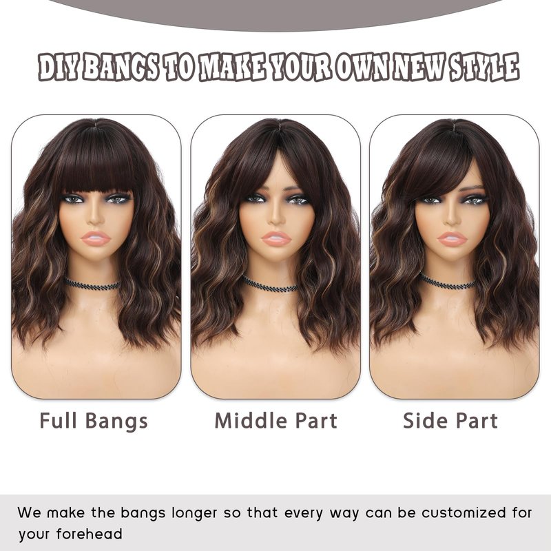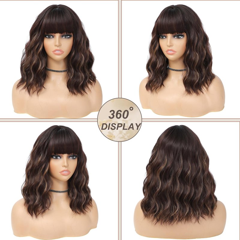 BEAUTIFA Brown Mix Blonde Wig with Bangs for Women 14 Inch Shoulder Length Short Bob Wavy Curly Wig Brown Mix Blonde Wig Heat Resistant Synthetic Wigs