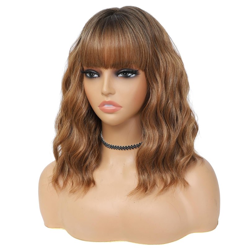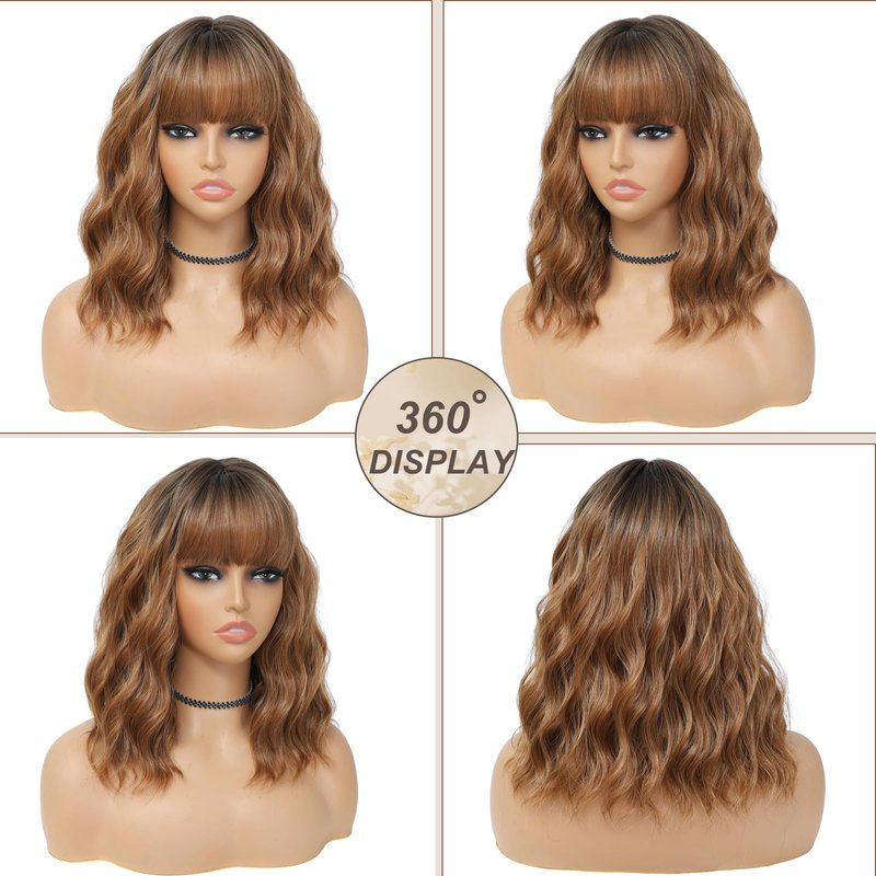 BEAUTIFA Ombre Brown Wig with Bangs for Women 14 Inch Shoulder Length Short Bob Wavy Curly Wig Ombre Brown Wig Heat Resistant Synthetic Wigs