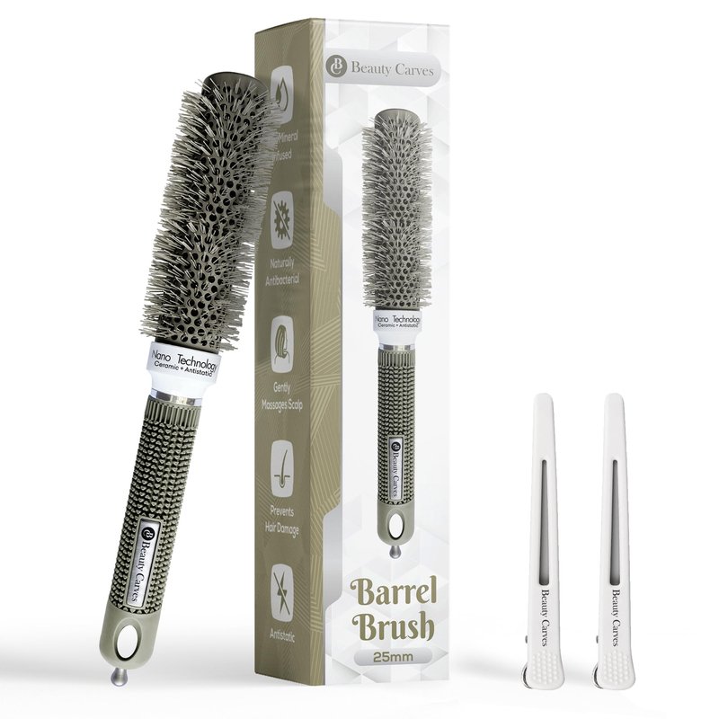 Beauty Carves Round Hair Brush, 25 mm Barrel with 2 Clips – Blowout Brush with Flexible Nylon 66 Bristles - Nano Ionic Heat Resistant Tech for Professional Curling, Styling & Shining Texture