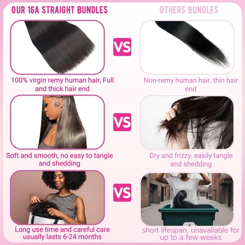 - 【16A Straight Bundles Human Hair Meterial】100% unprocessed brazilian straight human hair bundles, cut from the young girl donor, ensuring a natural, smooth, and soft texture,straight human hair bundles are thick and full ,seamless blend with your own hair, creating a flawless and undetectable look.