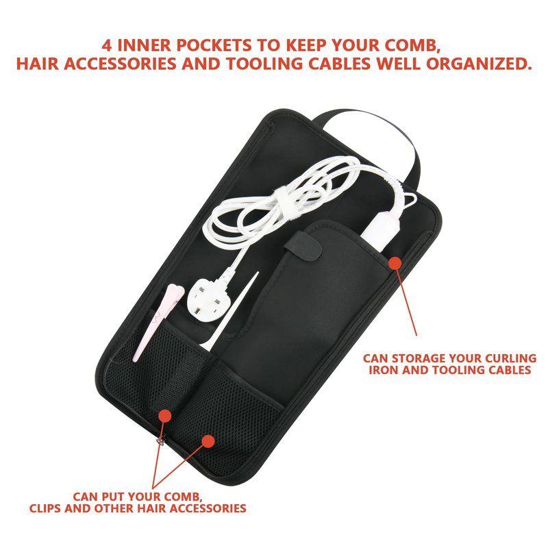 - This curling iron holder is designed to fit most size of hair styling tools, 4 inner pockets to keep your comb, hair accessories and tooling cables well organized.