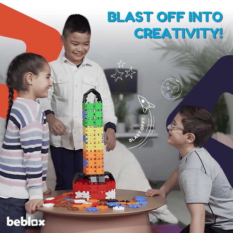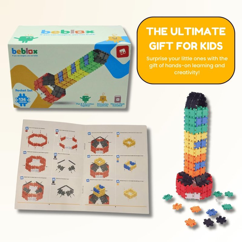 - BEBLOX ROCKET SET: Beblox Building Blocks boast an impressive collection of 136 interlocking tiles bursting with vibrant colors. This extensive set provides children aged 4 and up with ample opportunities for creativity and exploration, making it an essential addition to any young builder's collection.