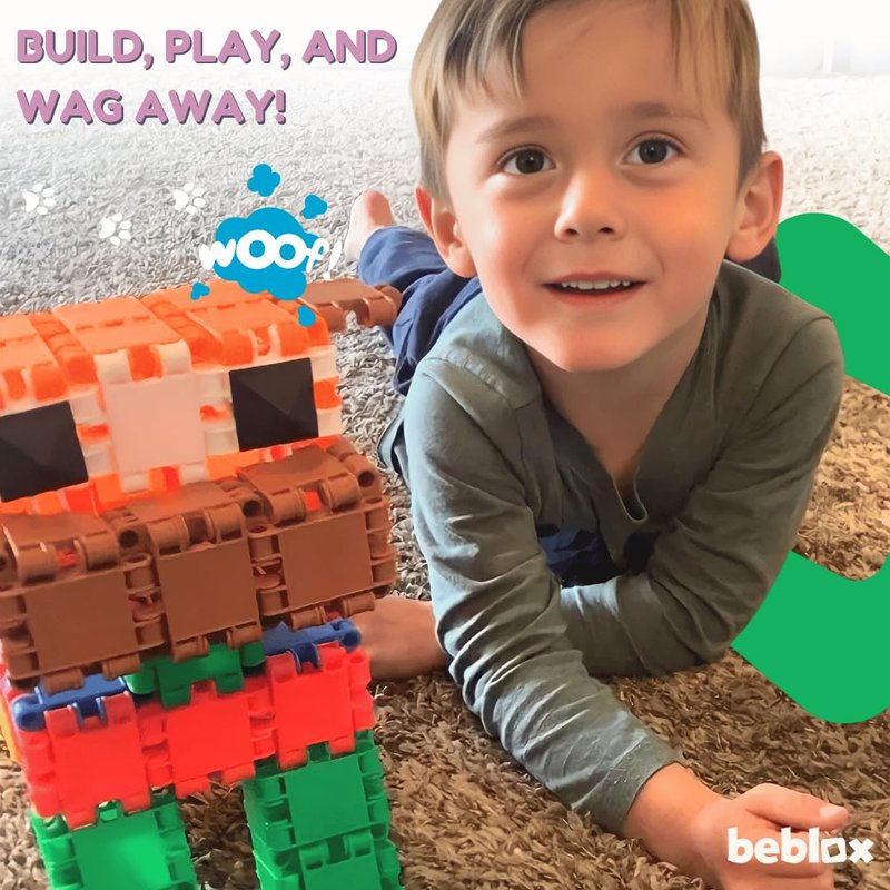 - 128-PIECE BEBLOX DOG SET: Beblox Building Blocks boast an impressive collection of 128 interlocking tiles bursting with vibrant colors. This extensive set provides children aged 4 and up with ample opportunities for creativity and exploration, making it an essential addition to any young builder's collection.