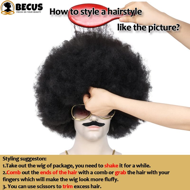 - ☀ 5PCS Black Big Afro Wig Set: 1* Big Afro Wig;1* Disco Glasses;1* Gold Necklace;6* Moustache;1*Cap Net.