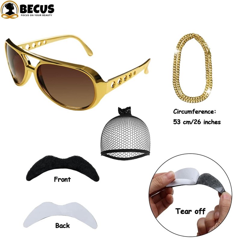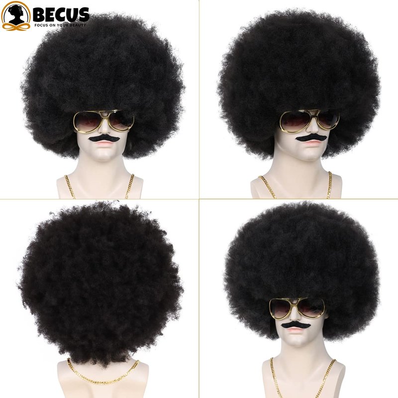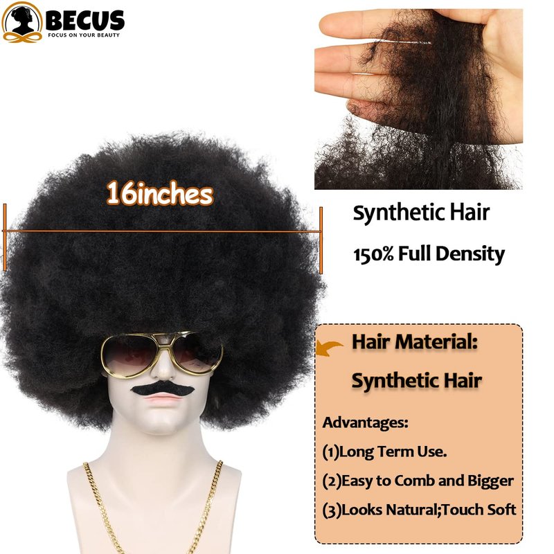BECUS 5pcs Afro Wig Men Set 1970s 80s Wig for Men, Disco Wig for Halloween Party, Short Wigs for Men Boys, Rocker Costume Set Wig for Cosplay Costume(Wig+Glasses+Mustache+Necklace+Wig Net)