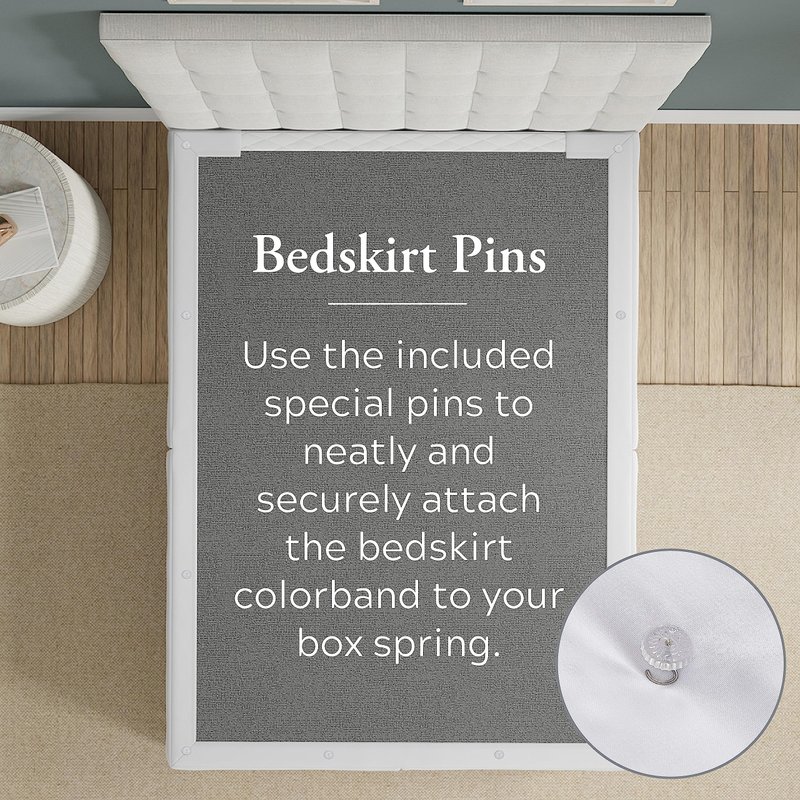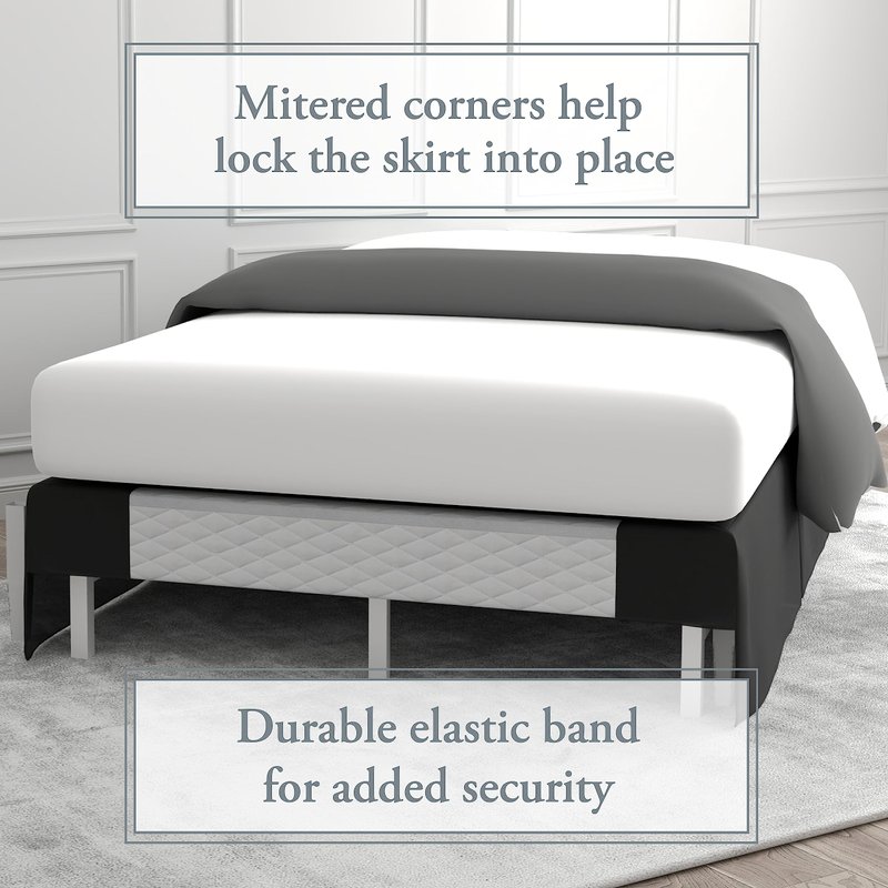 - Stays Put: The sturdy elasticized strips and mitered corners ensure the skirt stays in place without sagging or shifting over time. This innovative bed skirt does not have a traditional fabric platform, so the mattress does not need to be lifted.