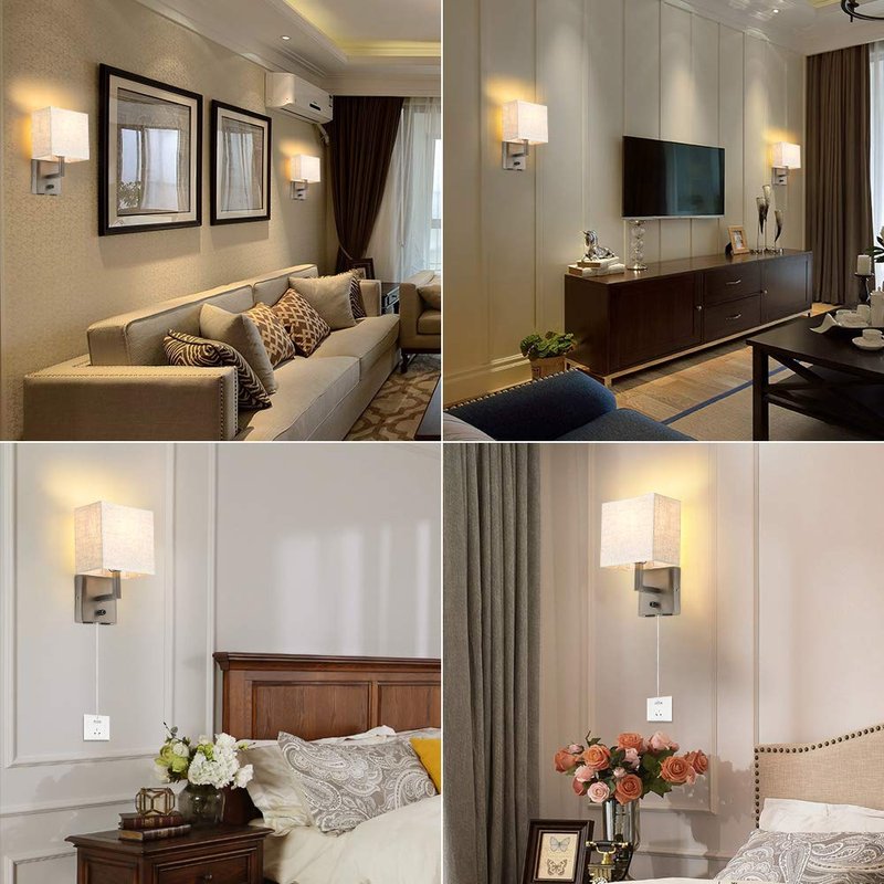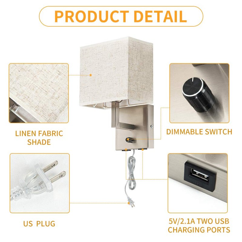 - 【Two USB Ports】 Our fabric wall lamp built-in two 5V/2.1A USB ports on the light base, which can easily and quickly charge two electronic devices simultaneously, such as mobile phones, laptops, tablets, kindle readers, etc. These USB ports function whether the lamp is on or off. Convenient your life.