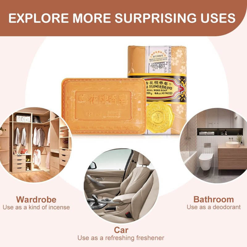 - BEE & FLOWER Sandalwood soap is made of slected materials, which gives you a delightful and lasting fragrance. This bar soap can be used not only for bathing, but also for soaking feet, aromatherapy, deodorization and so on. The package is exquisite and has the unique advantages of sandalwood soap