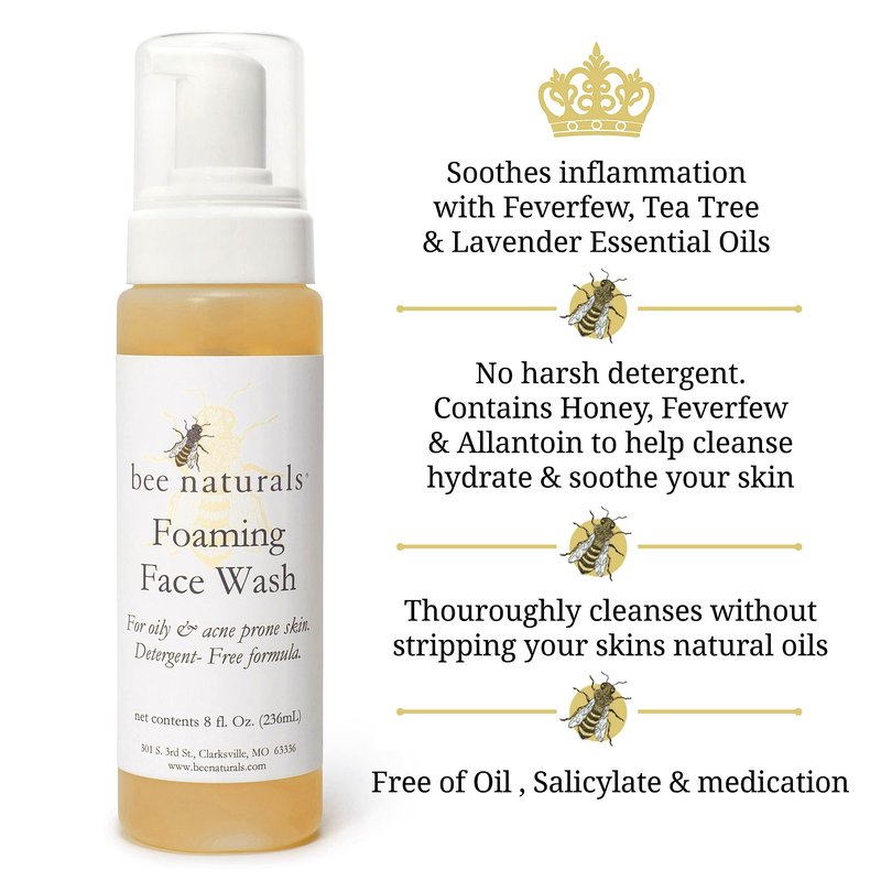 Bee Naturals Self Foaming Face Wash - Light, Foamy Cleanser for Oily & Troubled Skin - Soothes Inflammation - Rose, Grapefruit, Tea Tree and Lavender Essential Oils Plus Feverfew Extract - 8floz
