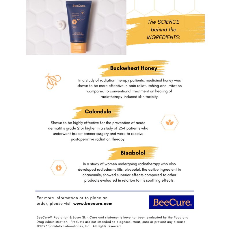 This BeeCure cream soothes, hydrates, and revives irritated skin resulting from radiation and laser therapy. The proprietary formulation of BeeCure Radiation & Laser Skin Care includes unique ingredients like buckwheat honey, calendula, and bisabolol.