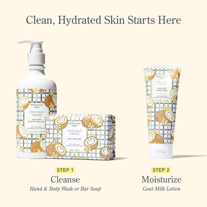 - HAND & BODY WASH - Formulated with goat milk & a sensitive skin-safe, microbiome-friendly fragrance to cleanse & hydrate with the soothing scent of coconut. Microbiome friendly fragrances use ingredients that don't disrupt the skin's microbiome.
