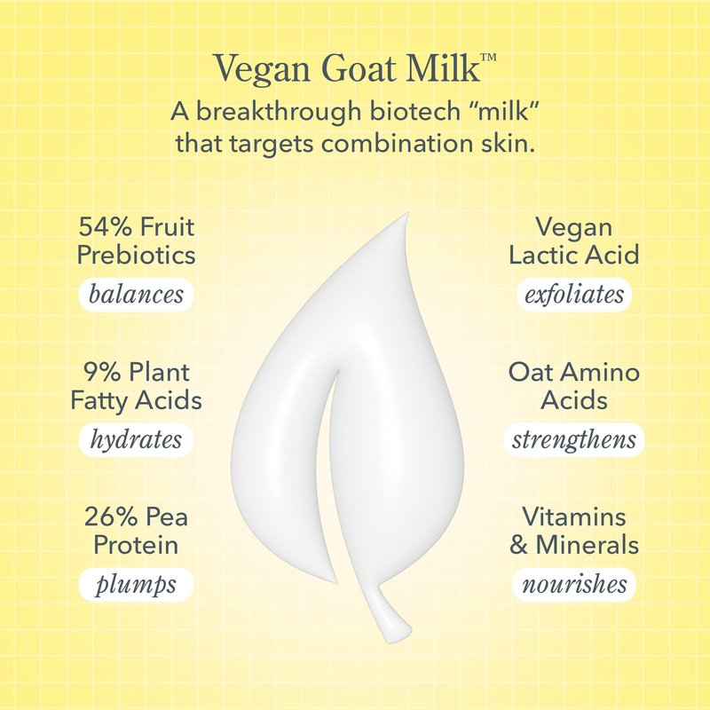 - THE VEGAN GOAT MILK DIFFERENCE - We reverse-engineered the 31 key nutrients of goat milk to create a 100% plant-based version. Lighter in texture, designed for oily/combination skin—it’s clinically proven and barrier-friendly.