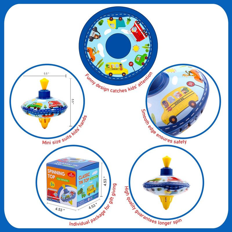- Simple Pleasures: Our spin top features adorable vehicle patterns in vibrant colors, which effortlessly captures children's attention. When it spins fast, it makes a cool humming sound of the Gyro that keeps kids entertained for hours