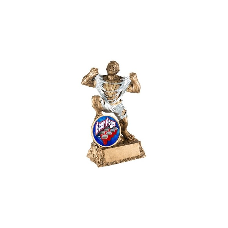 Beer Pong Monster Trophies. For a "Monster" Beer Pong Champion. This unique award is perfect for a beer pong champion trophy. Includes 3 lines of custom text that are added to a gold metal plate which attached to the base. Available in 6.75" or 9" tall size.