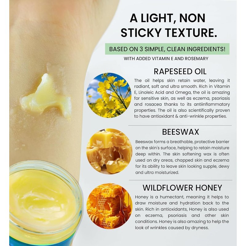 - NON-GREASY, NON-STICKY TEXTURE - Unlike many conventional products that clog pores when used, Beeseline glides onto skin and provides it with much needed moisture while maintaining a light texture. Skin protective beeswax creates a moisture barrier that your skin can breathe through, leaving skin happy and glowing.