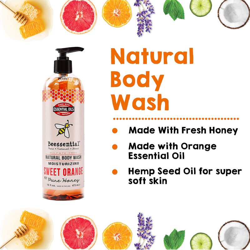 Beessential Natural Body Wash, Sweet Orange, Sulfate-Free Bath and Shower Gel with Essential Oils for Men & Women, 16 oz