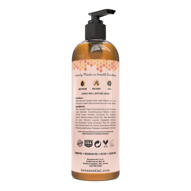 Beessential Natural Body Washes made with gentle Hemp, Honey and Aloe. Safe for Sensitive Skin. Our natural formula is Paraben, PEG and Sulfate-Free, and made with pure, plant-derived ingredients like Vegetable Glycerin. Beessential's moisturizing body washes cleanse with ultra-hydrating Coconut, and Olive Oils while creating a rich, luscious lather your soft, healthy skin will love to indulge in.