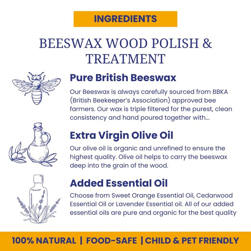 - π 100% Natural and Pure Beeswax Polish and Conditioner enhances and restores all types of wood surfaces, both natural and treated, bringing back the Natural Lustre and Beauty and giving it the perfect, lasting, durable and protecting finish