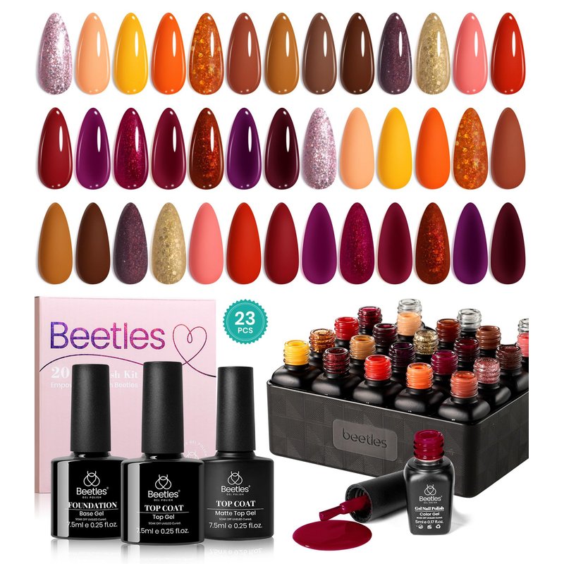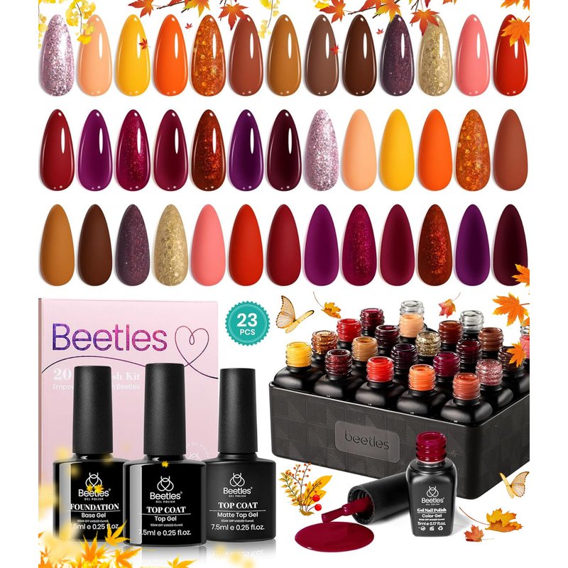 Beetles 23Pcs Fall Gel Nail Polish Kit Winter 20 Colors with Base Gel Top Coat Orange Brown Burgundy Red Yellow Gel Polish Set Soak off Uv Golden Glitter Holiday Nail Art Gift for Girls