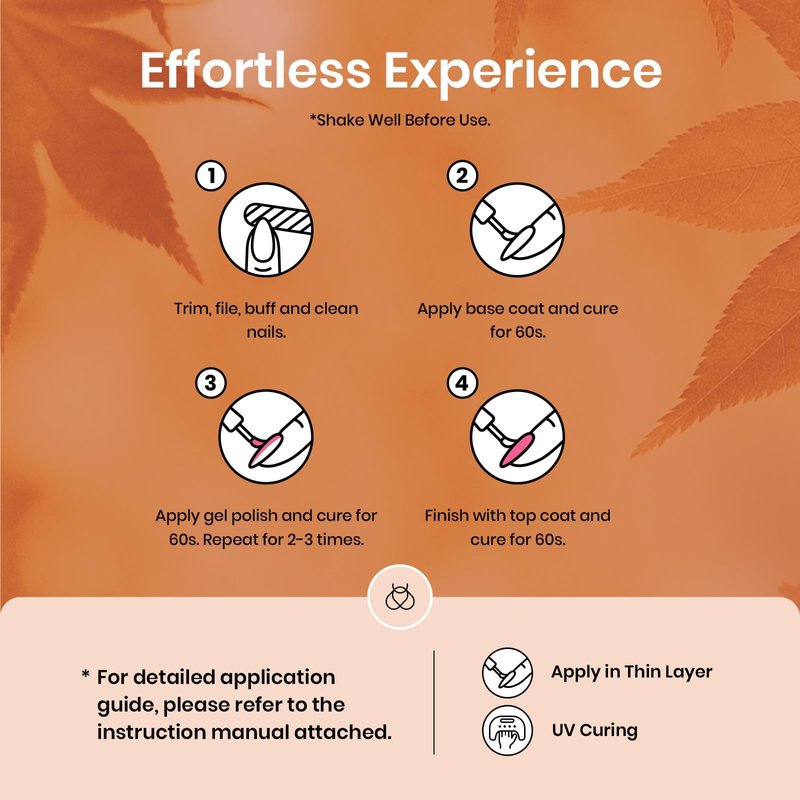 2. Base Coat: Apply thin base coat, cure under UV/LED lamp for 60-90 seconds.