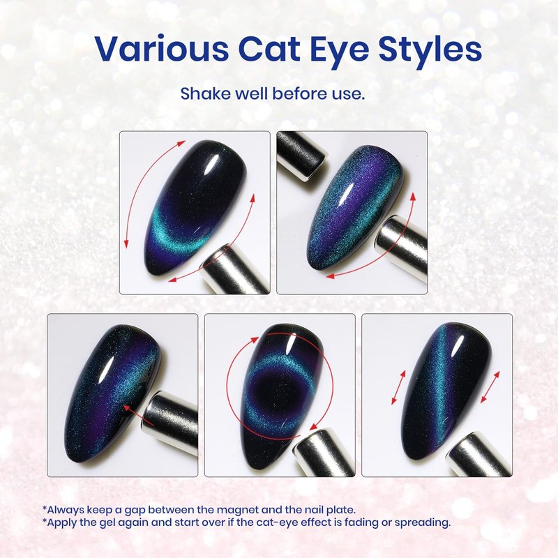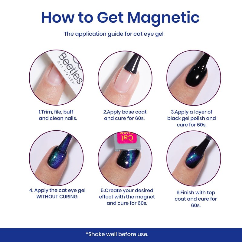 - 【Cat Eye Gel Nail Polish】Beetles 1 Color cat eye gel nail polish offers various ways of playing that can be achieved with cat eye magnets. Popular and trendy colors are suitable for all seasons and daily routines! (Please note that the base color gel is not included in the package.) Tips: Place the magnetic stick over the surface about 3-5mm for 5-10 seconds to get your desired effect!