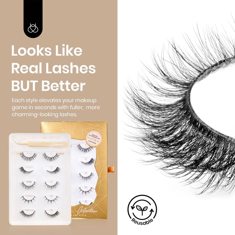 - Beetles Essential Collection Lashes Strips: For those who prefer their lashes to look natural. Beetles' 5 mixed-style must-have classic lash strip complement everyday scenarios and a variety of makeup vibes. The lash styles "4ever", "W!nk" , "Popular", "Waltz" and "Twinkle" are ready to take you from a day at the office to dinner parties and dates, making your eyes look beautiful. Fibers measure from 12mm. The package includes 5 pairs of false lashes and eyelash applicator tool - tweezers (glue not included).