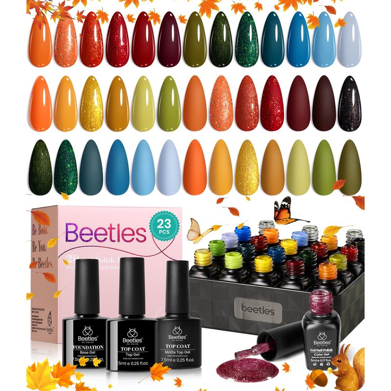 Beetles Fall Gel Nail Polish Set 20 Colors Nail Gel Polish Blue Red Brown Black Yellow Orange Green Gel Nail Polish Kit with Glossy Matte Gel Top Base Coat Soak Off Uv Gel Nail Lamp Gift for Women