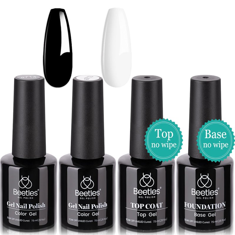 - Beetles Basic Gel Polish Kit - This kit includes 4pcs 7.5ml Black White Gel Nail Polish with No Wipe Top Coat and Base Coat, which is an ESSENTIAL for everyone! Suitable for Spring' nail art, nail salons, or DIY nail art, natural nails, gel nails, artificial nails, acrylic nails, nail tips, etc. Color Numbers are: a713-a714.