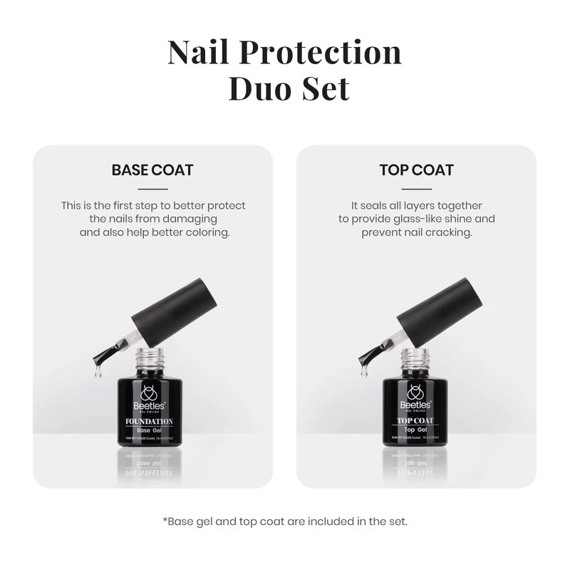 - Beetles Gel Top Coat and Base Coat: 2pcs 7.5ml, Long-lasting for 28+ days with perfect shine. Flexible top coat avoids nicks, chips, or smudges. Compatible with All Brands Soak-off Spring Pastel Gel Nail Polish.