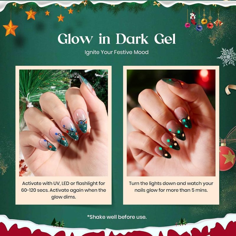 - Glow-in-The-Dark Liner Gel Polish:The top-notch luminous powder can glow brightly at night and is made from permanent reusable materials which means after the gel nail polish loses its light, you can make it glow again by putting it under the U V light.