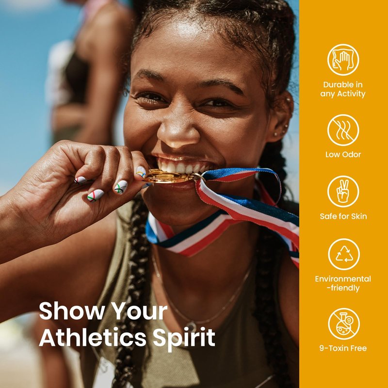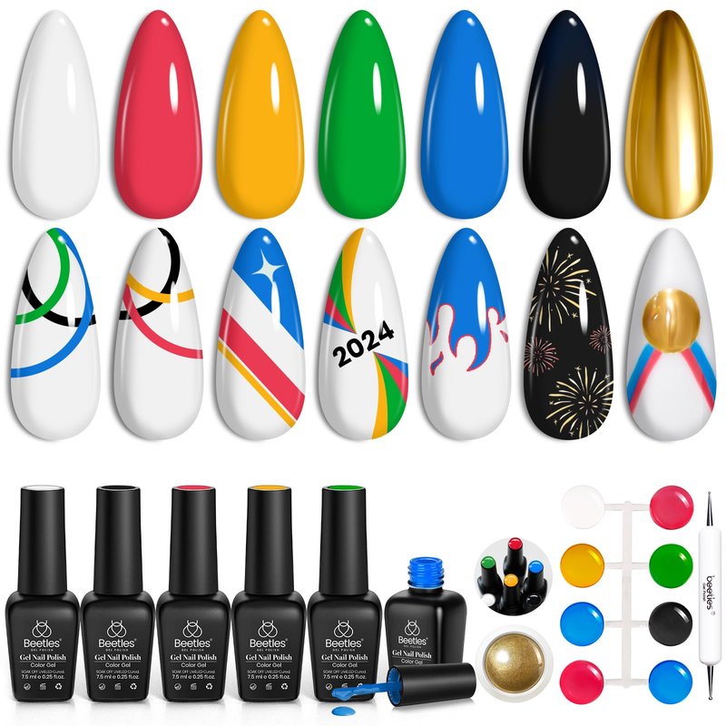 Be Bold, Be You, Be BeetlesBeetles color glue 7-color set not only shows you the dazzling luster of gold medals, but also has unique designs that light up your creative moments! Comes with golden magic mirror powder, which is as dazzling as a gold medal, adding a touch of golden light to your creation. The double-ended pen exclusively designed by Beetles outlines golden lines, making every stroke full of triumphant joy.The newly added Color Card makes it easy to identify colors quickly. The set comes with Color Card and double-sided tape. You can apply the color glue evenly to the back of the Color Card Doudou (it feels flat to the touch) and just apply it once. Lighting for 30-60s. Attach the supplied double-sided tape to the back and then onto the bottle cap.Beetles neon gel polish, 2024 nails trend color 6 Gorgeous shades of Rainbow Nails, Summer Gel Nail Polish Set. 6 Gel Colors (7.5ml/each bottle), Golden Chrome Nail Powder*1, Double-ended Brush*1, Color card beans*3. Sports trend will ignite your summer sports passion! This set perfectly combines the power of sports with the energy of summer.