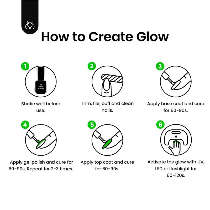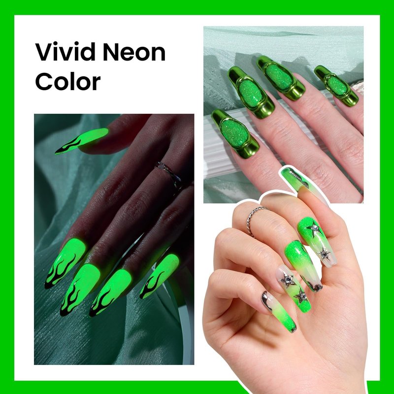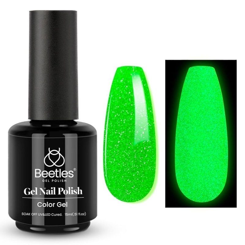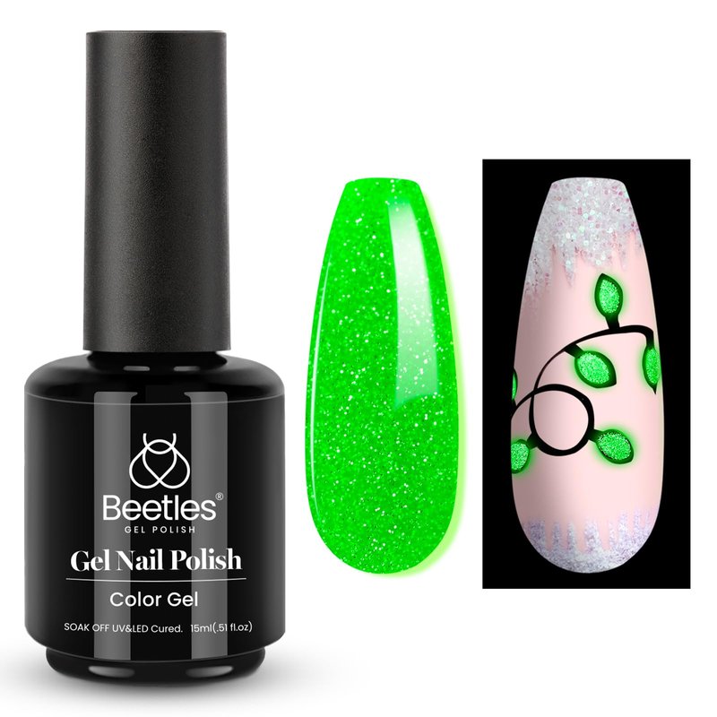 - Glitter Green Glow: After being irradiated by light, beetles fluorescent green gel polish glow-in-the-dark gel nail polish can keep the glow in the dark. With your inspiration, design more fun ways to add festive spirit and enjoy the fantastic glow at night!