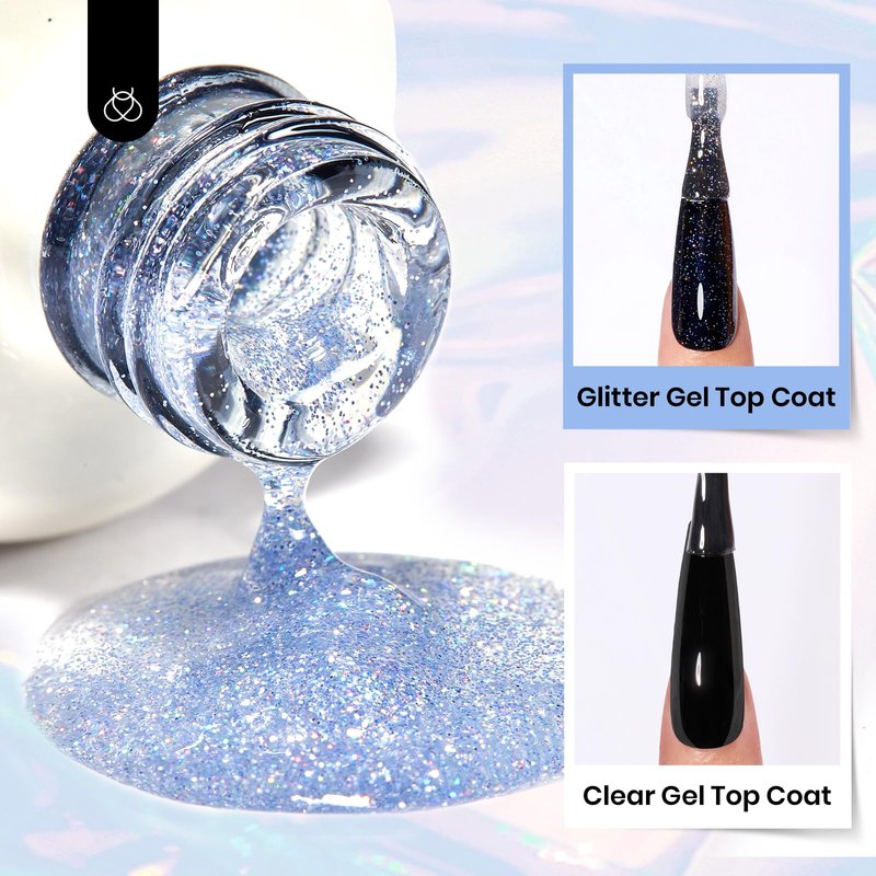 - Glitter Gel Top Coat for Any Colors: Formulated with flash reflective powder and holographic particles. Turn any gel polish into glitter and work well with every color. Suitable for nail manicure by using gel polish, poly nail gel, builder nail gel, color base, color nail tips, and so on