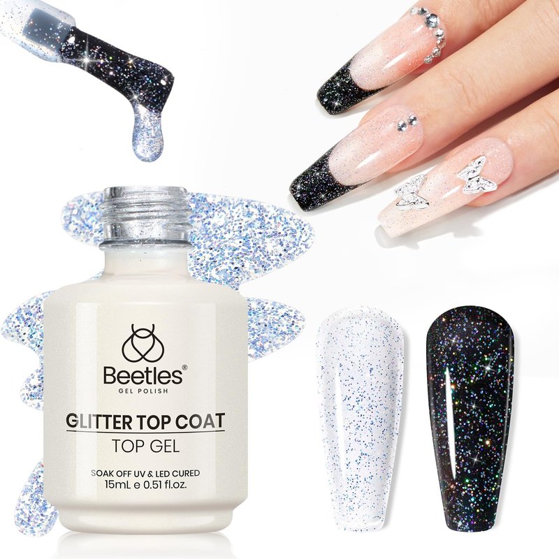- Beetles No Wipe Glitter Top Coat: Long-lasting for 28+ days with perfect sparkle and shiny. A flexible topcoat avoids nicks, chips, or smudges. This is perfect for the holidays.