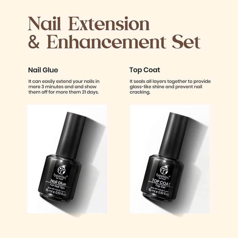 - 5 In 1 Base Gel & Nail Glue Kit:Our new Nail Glue Gel Kit includes 15ML Nail Glue Gel and Top Coat. You can easily extend your nails and enjoy the fun of DIY! This Multi-functional Nail Glue is not only for nail tips adhesive, but also can be used as Base Gel,Blooming Gel,Rhinestone Glue Gel,Slip Solution! Let it do the magic with you! Warm Tips: Beetles Uv Nail Glue Gel Set Could Used for Clear Nail Tips,Not for Solid Press on Nails!