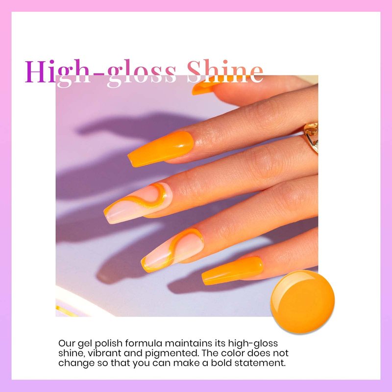 - Soak off LED Gel Nail Polish: Neon gel nail polish kit in neon yellow, pink, orange, pastel baby blue, and sparkle gel polish need to be cured under an LED nail lamp. Base and Top coat are required. Average time for LED light is 60-120 secs, nail dryer 2-4 mins.