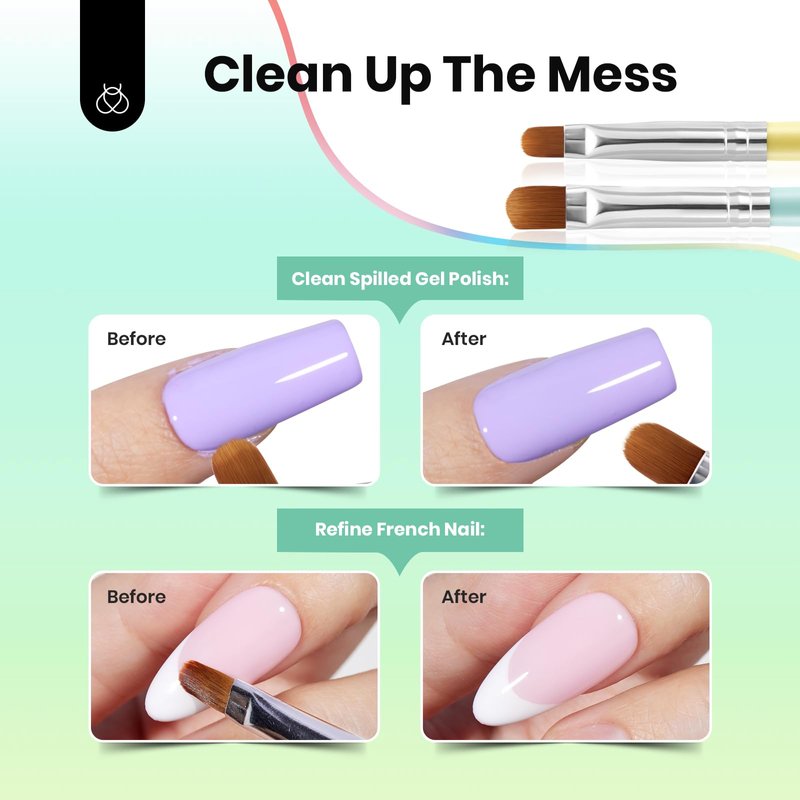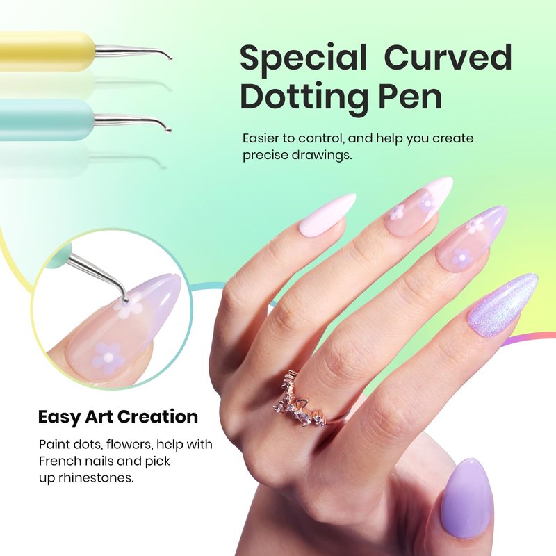 - 【Double-ended Nail Art Pen* 2 】One end is a Large Brush:can be used to clean gel/glue spills, erase fine lines, assist in French manicure, fill in primary colors, blooming, etc. The other end is a Large Dotting Pen: thoughtful arc design, does not block the operating line of sight, allows more accurate operation of spilled glue or fine line cleaning, and can also assist in dotting rhinestone decorations, circles, flowers and other styles.