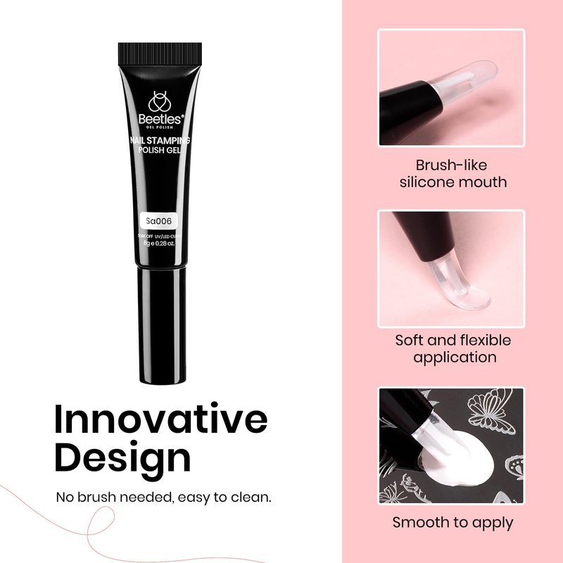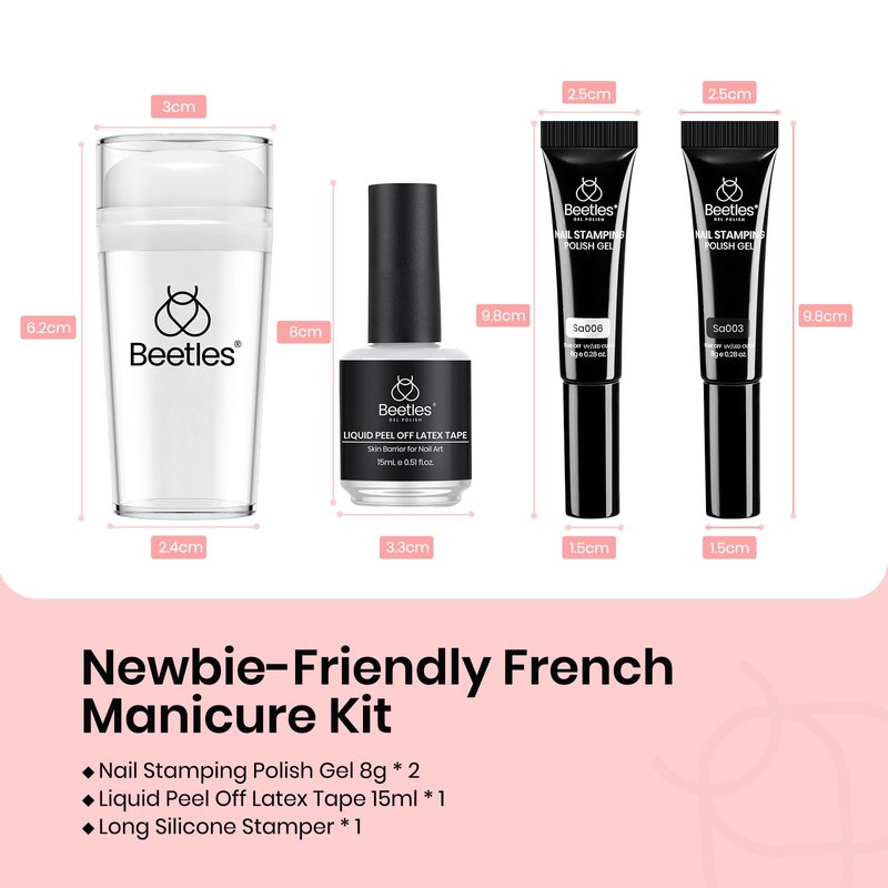 - Beetles Stamp Gel: This French tip nail tool kit, a perfect New Years gift, includes nail stamping polish gel 8g*2, a liquid peel-off latex tape, and a long silicone stamper. You can take your favorite patterns on the scraper and then stamp. This nail art printing tool helps you to DIY nail art easily and quickly.