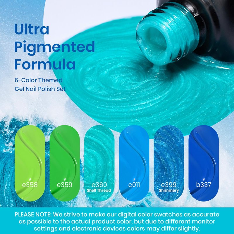 Beetles Summer Blue Gel Nail Polish, 6 Colors Shimmer Swirl Pacific Blue Glitter Blue Green Gel Polish Swirl Shell Thread Effect Soak Off Nail Art Design Salon Home Manicure Gift for Girls Women